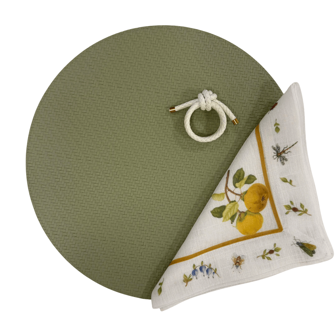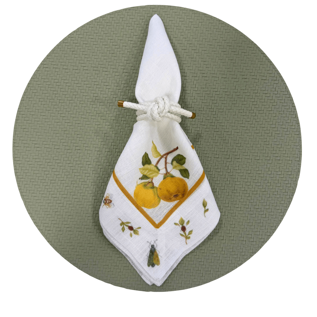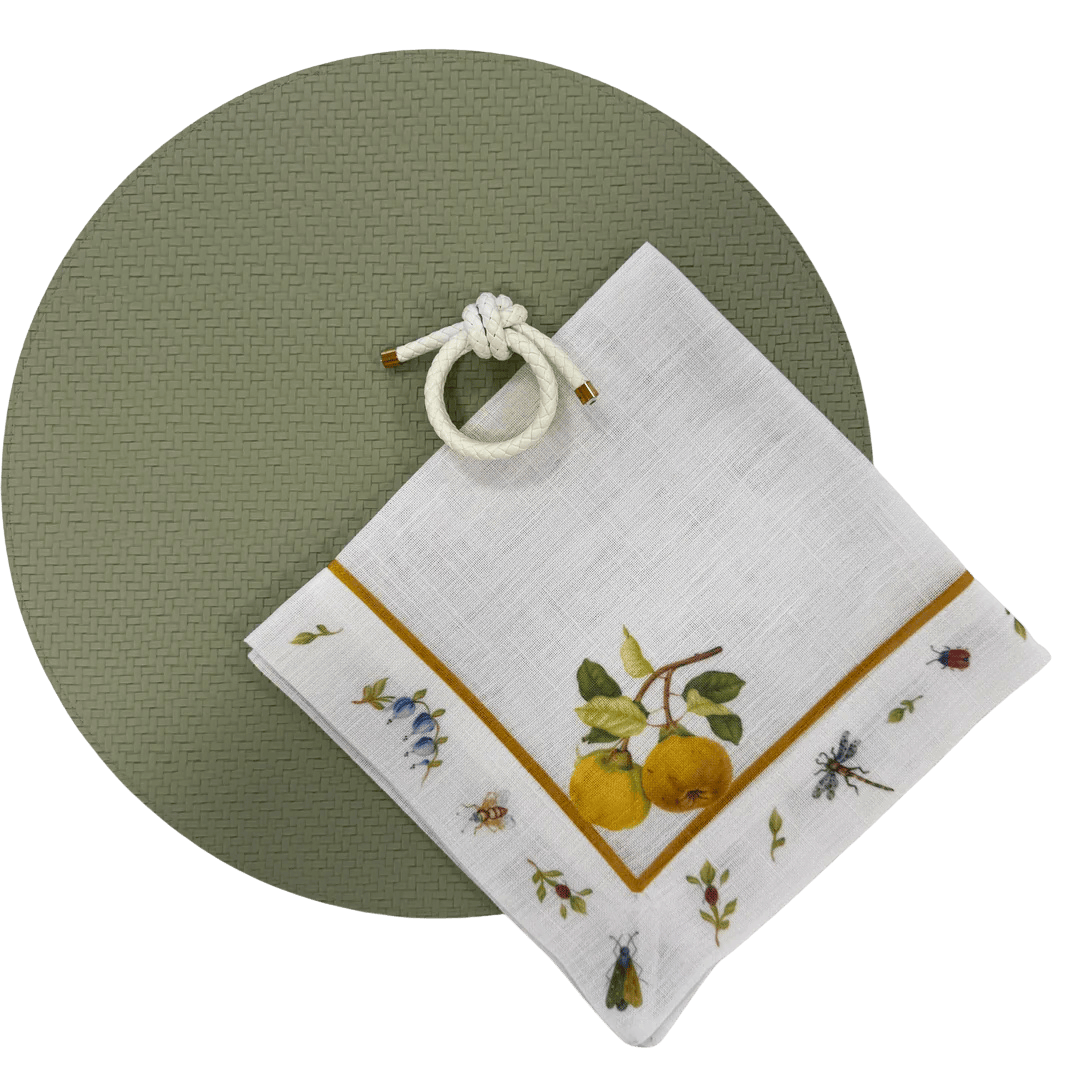 - 1 Conjunto refere-se a 1 unidade de jogo americano, com o guardanapo de linho estampado e o porta guardanapo Rope by Kim Seybert