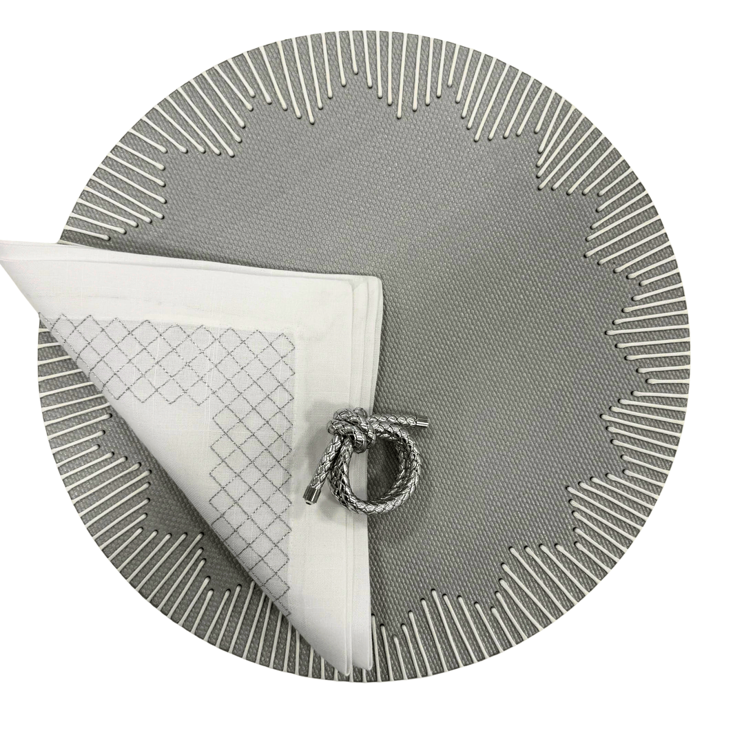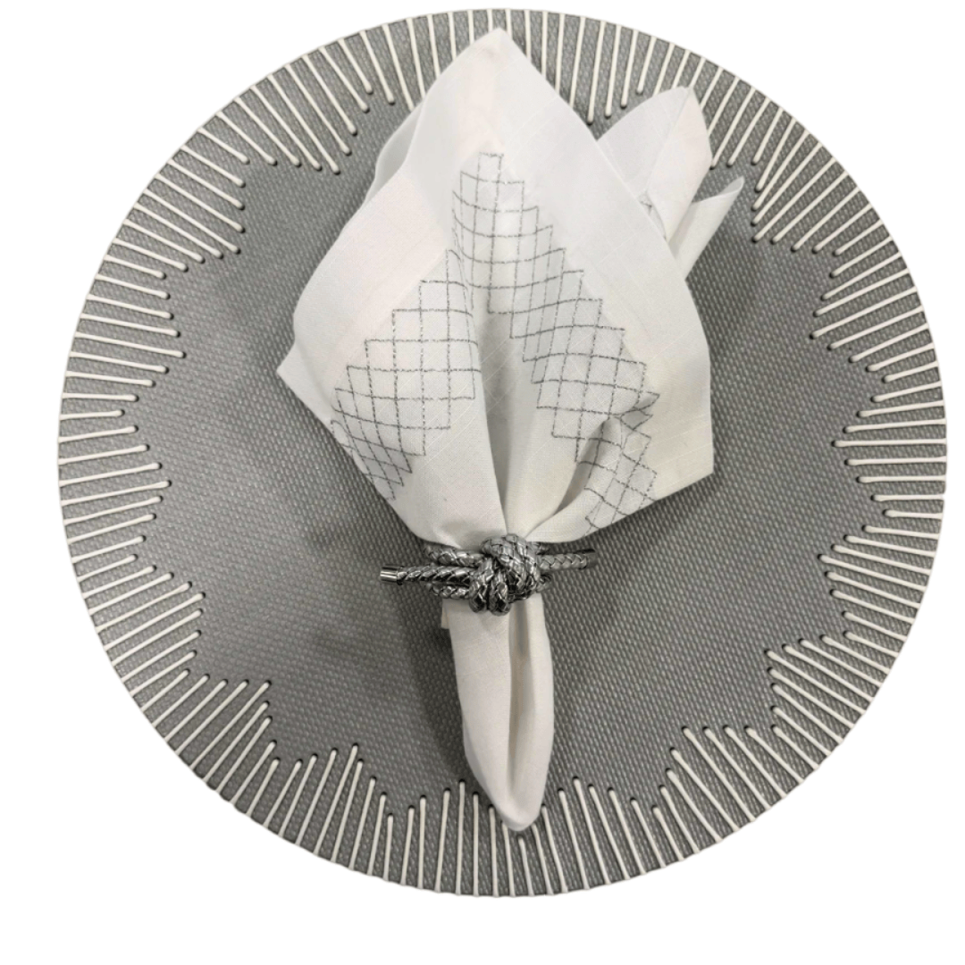 - 1 Conjunto refere-se a 1 unidade de jogo americano, com o guardanapo bordado em prata e o porta guardanapo rope by Kim Seybert